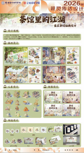 本设计选取磁器口吊脚楼、山城巷、黄桷垭坝坝茶、防空洞四类重庆特色茶馆为主体,以插画形式再现山城茶饮文化。结合轴侧构图、地域色彩与光影营造,融合建筑风貌与人文烟火,让重庆传统茶俗与江湖风情焕发年轻化表达。