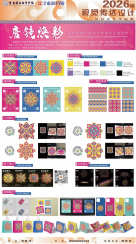 “唐镜焕彩”文创设计针对唐代铜镜纹饰传承断层,以现代设计诠释文化精神。提取经典纹饰融入文创,结合数字化手段让传统走进生活。作品传递历史美感,增强文化认同,坚守传统内核并赋予当代活力,推动唐镜艺术传承发展。