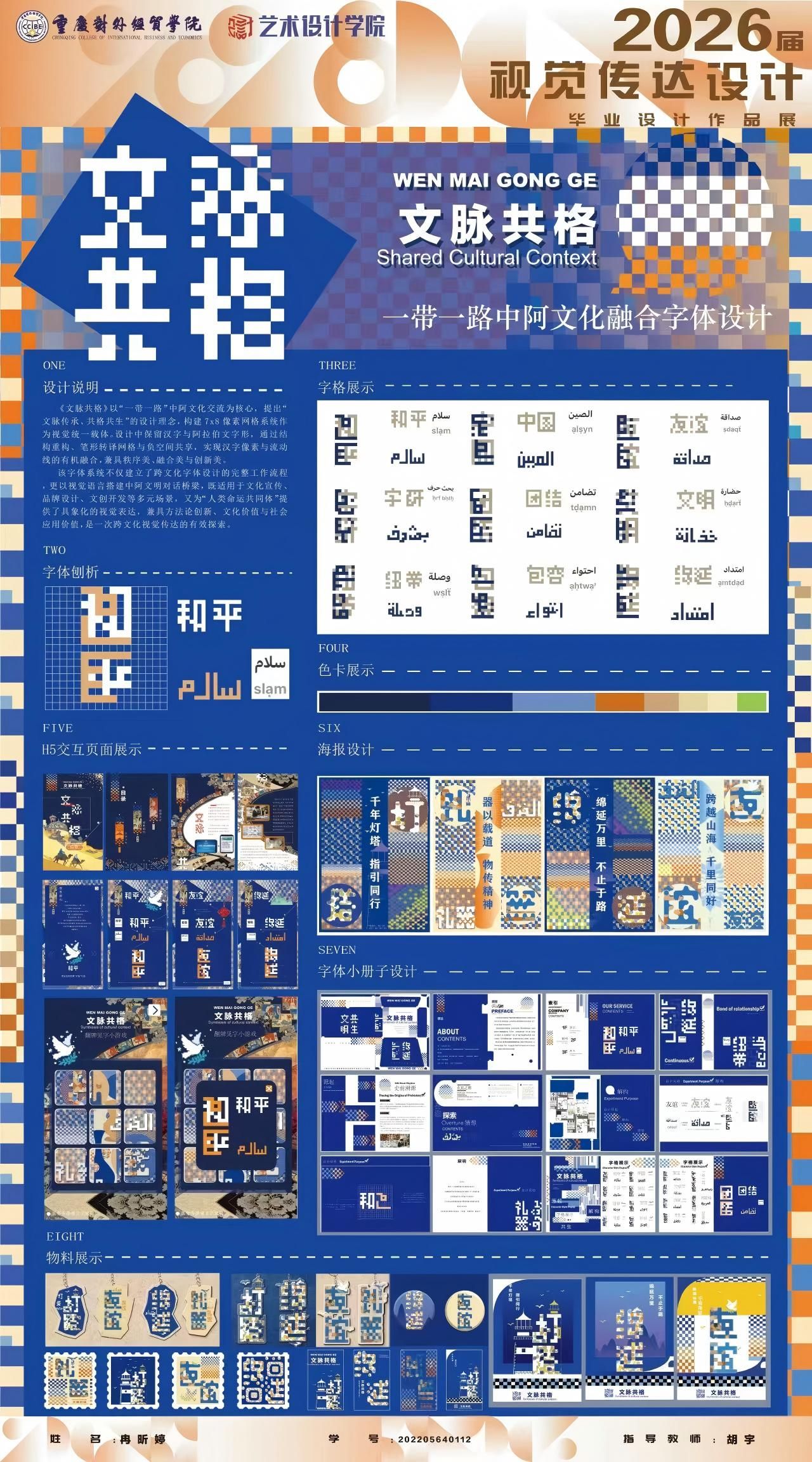 本设计以“一带一路”中阿文化交流为核心,以“文脉传承、共格共生“为设计理念,构建7x8 像素网格系统作为视觉统一载体。设计中保留汉文与阿拉伯文字形,通过字体网格化、重构、负空间共享,实现双方字体有机融合。