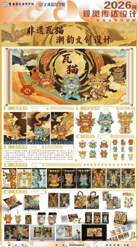 本设计以“非遗瓦猫潮韵文创”为主题,融合瓦猫传统寓意与国潮风格。运用点线面手法,结合非遗色彩纹样,融入招财、祈福、镇宅等文化符号,打造文创系列。最终实现“让非遗走进生活,让国潮承载文化”的创作目标。